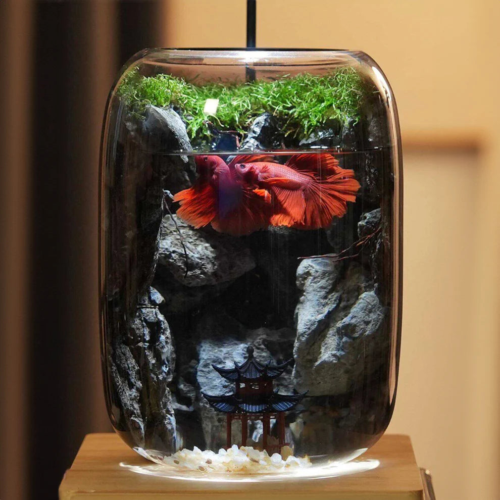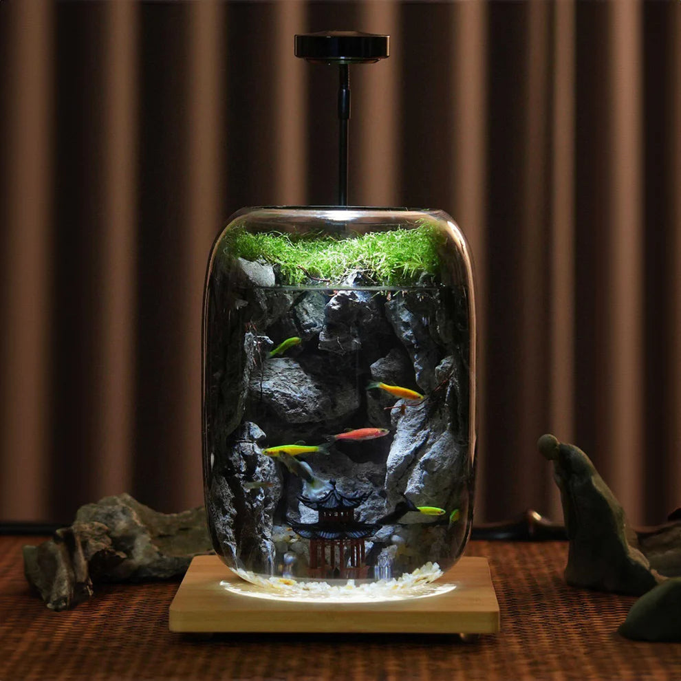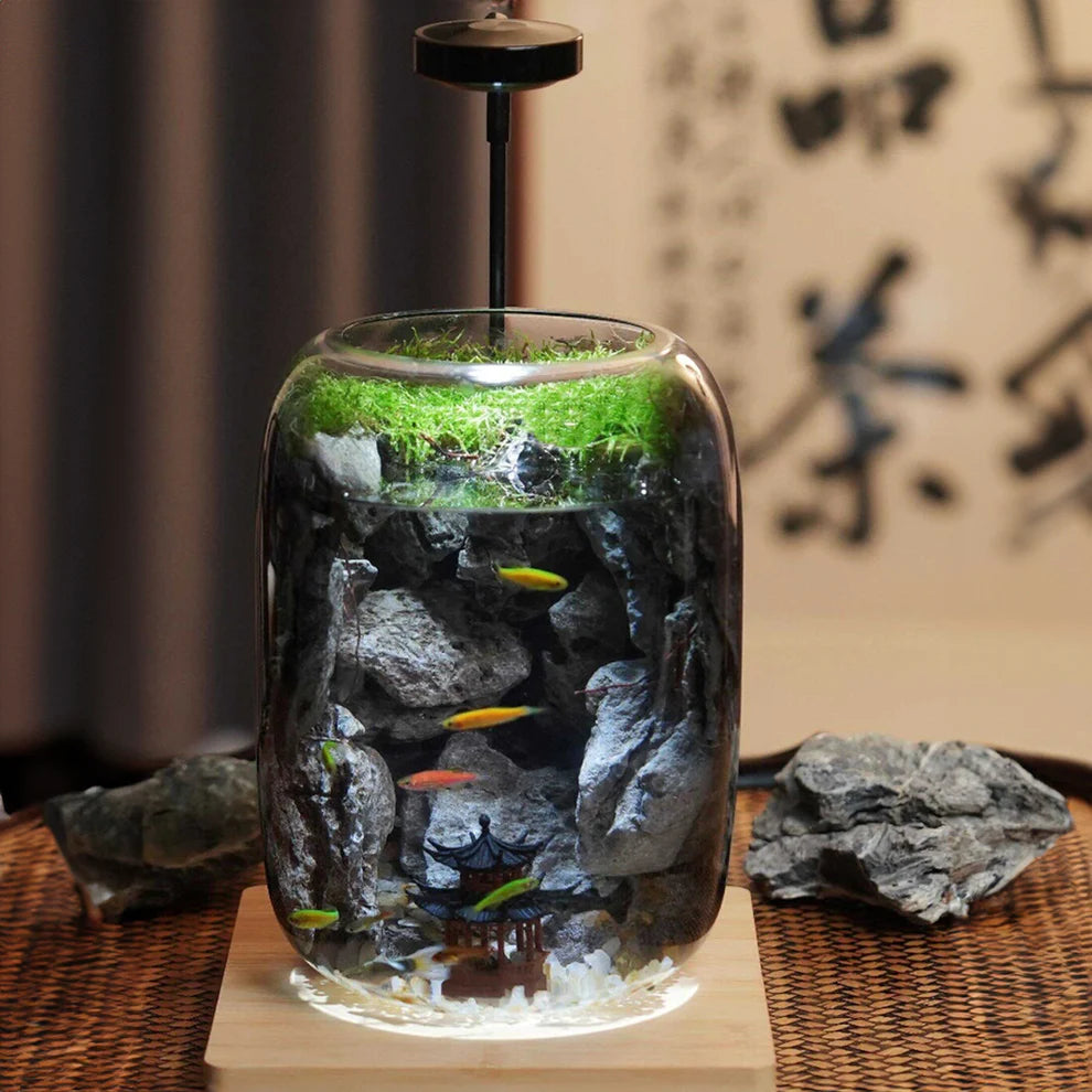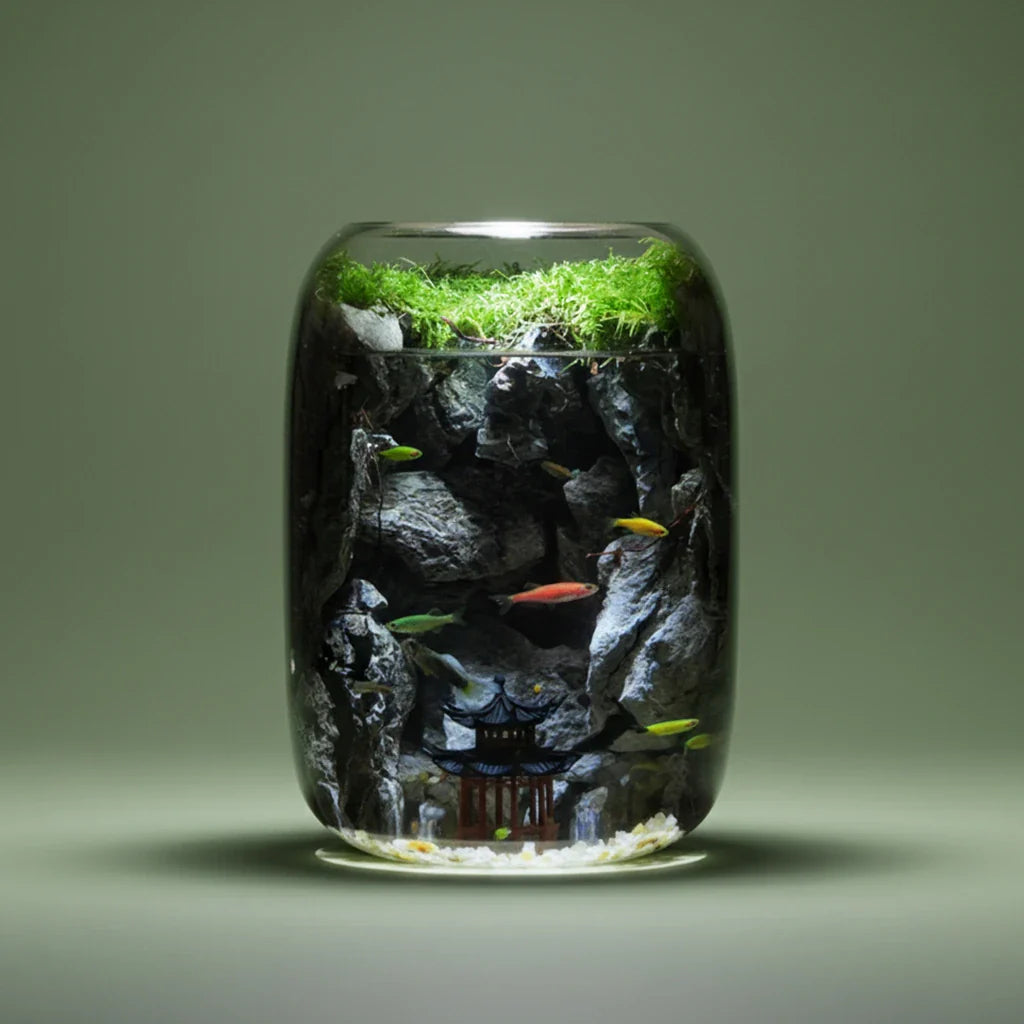 A carefully balanced aquatic world where fish, water, and stone coexist in natural harmony, creating a sense of calm and movement.